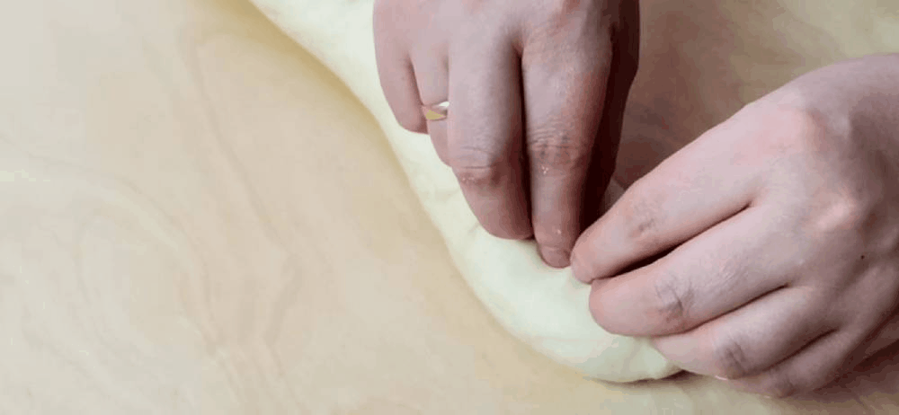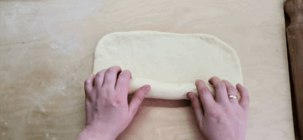 4. Odgazowujemy ciasto i dzielimy na dwie części. Wałkujemy na prostokąt i zawijamy w rulonik.