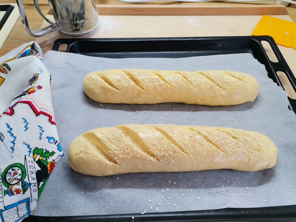 6. Wyrośnięte batony nacinamy, smarujemy jajkiem i posypujemy sezamem. Pieczemy przez 30 minut. Smacznego!