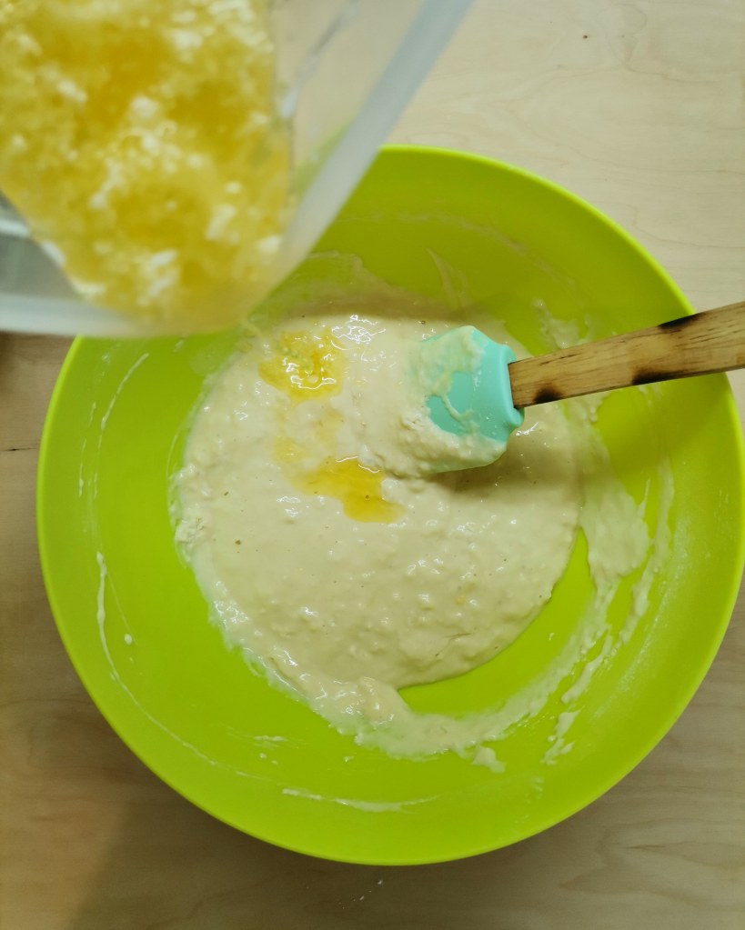 2. Roztapiamy masło. Wbijamy jajko do zaczyny, dolewamy pozostałe mleko, przesiewamy połowę mąki i zaczynamy wyrabiać mikserem lub łyżką. Dodajemy masło wyrabiamy ciasto dalej.