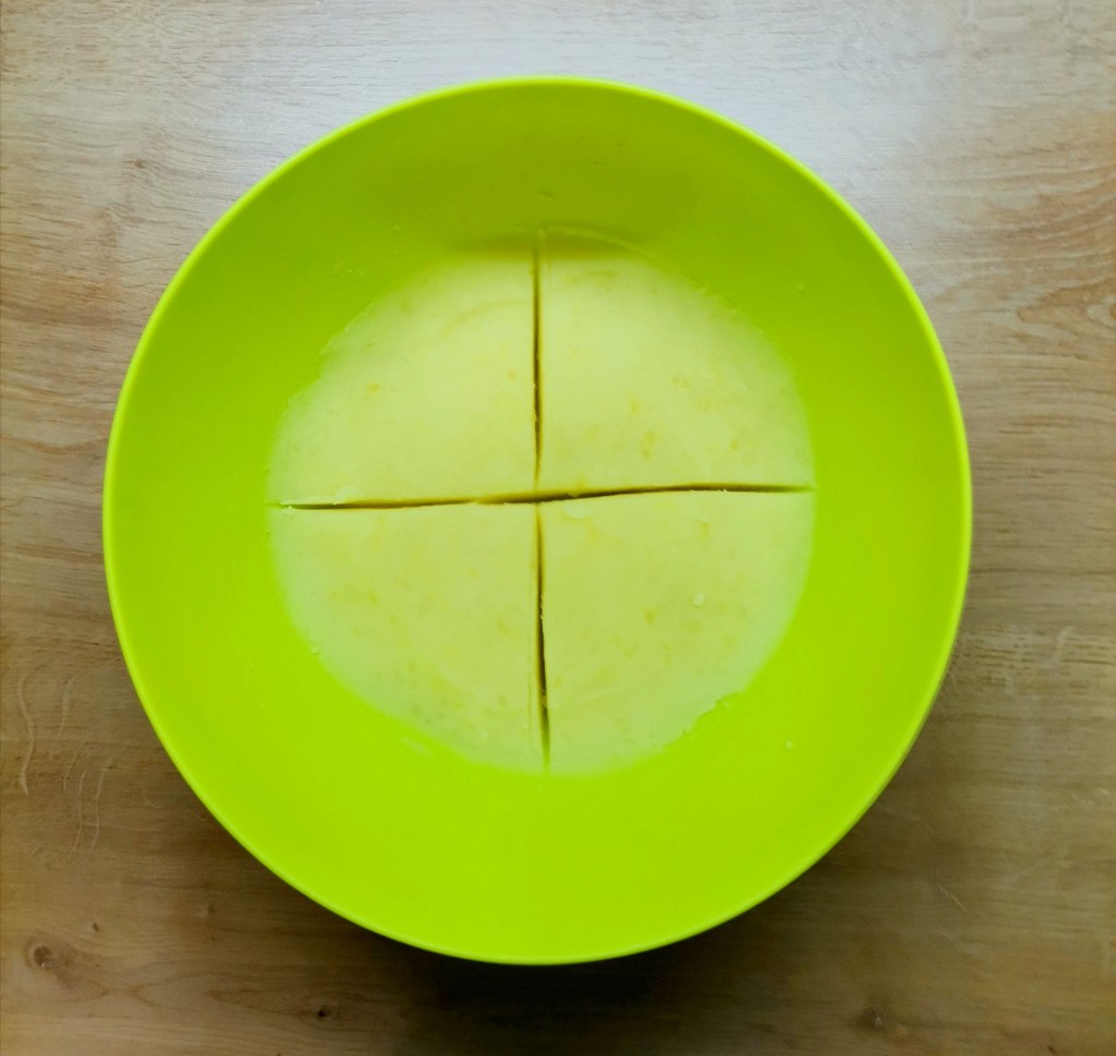 Wyjmij jedną część, wypełnij mąką ziemniaczaną i wbij jajko.