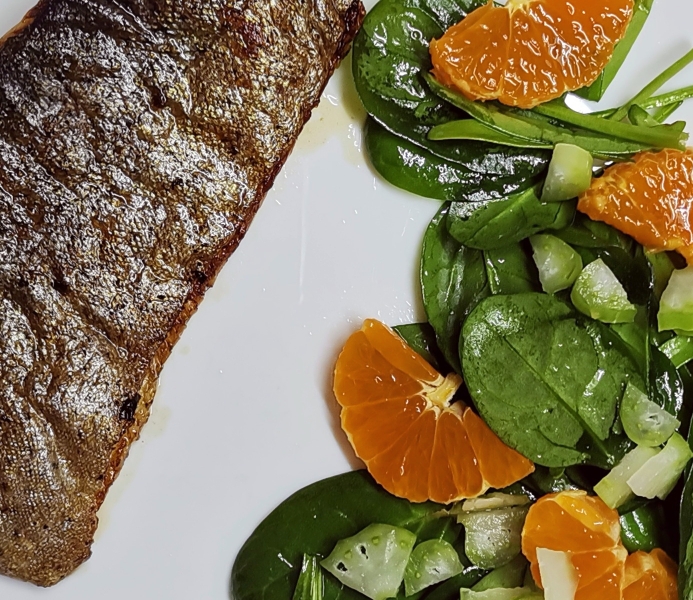 Filetujemy pstrąga. Rozgrzewamy patelnie wrzucamy masło i po chwili dodajemy filety. Smażymy od strony skóry do gotowości starczy parę minut. W międzyczasie obieramy mandarynki kroimy wzdłuż. Szpinak, sok z cytryny oliwę, mandarynki i pokrojony seler mieszamy. Serwujemy z filetem pstrąga. Smacznego!