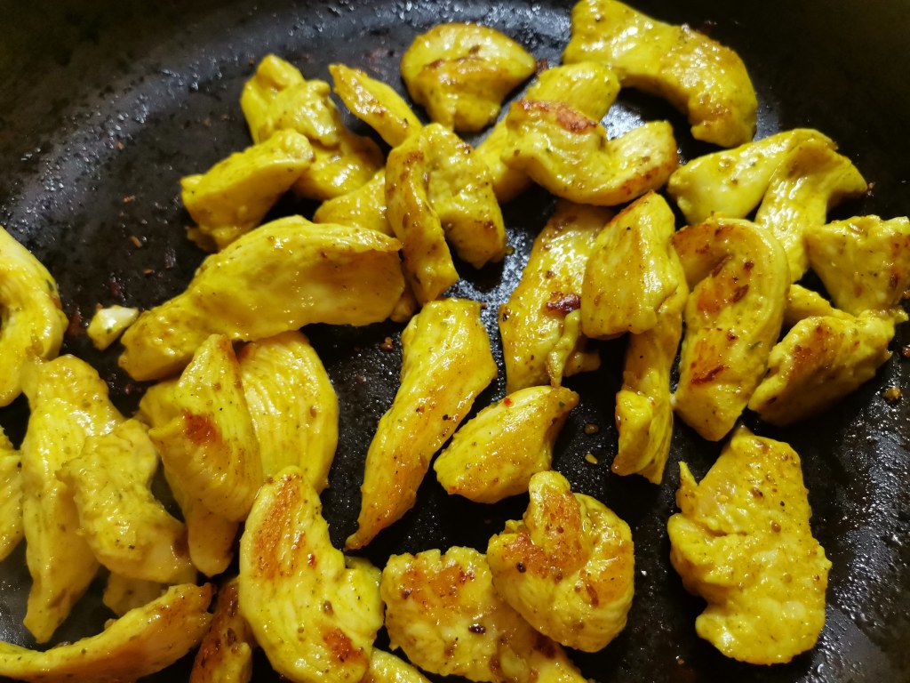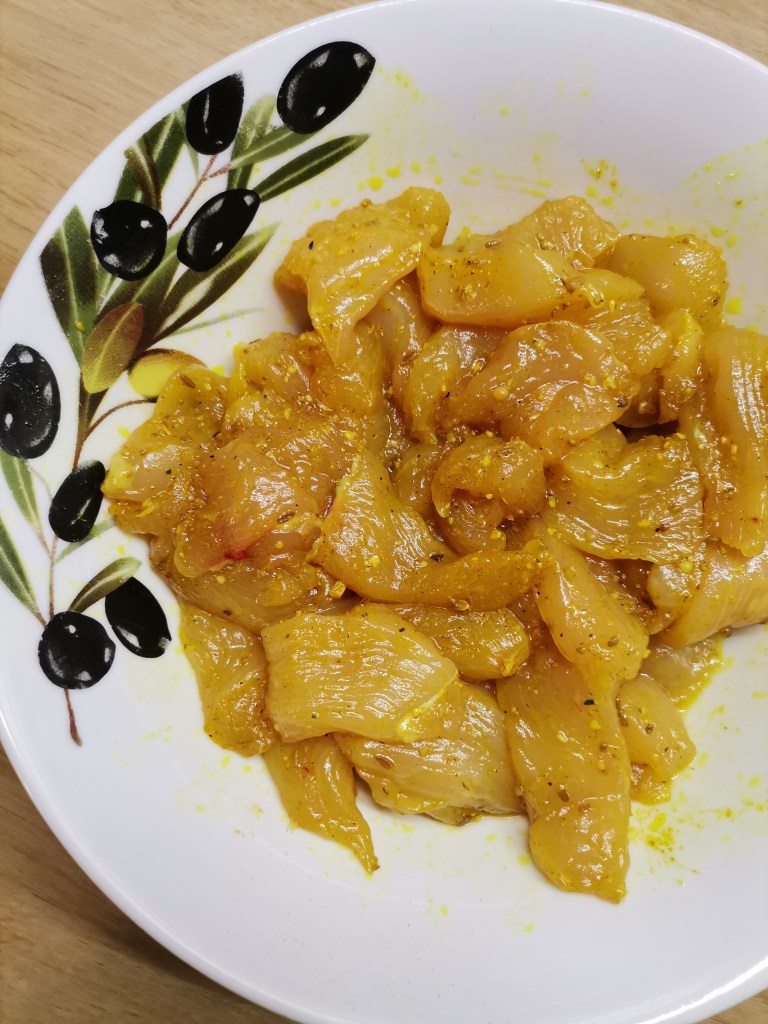 Pokrój kurczaka, dodaj 0,5 łyżeczki oleju kokosowego i 1 łyżeczkę curry. Marunuj przynajmniej 15 minut.