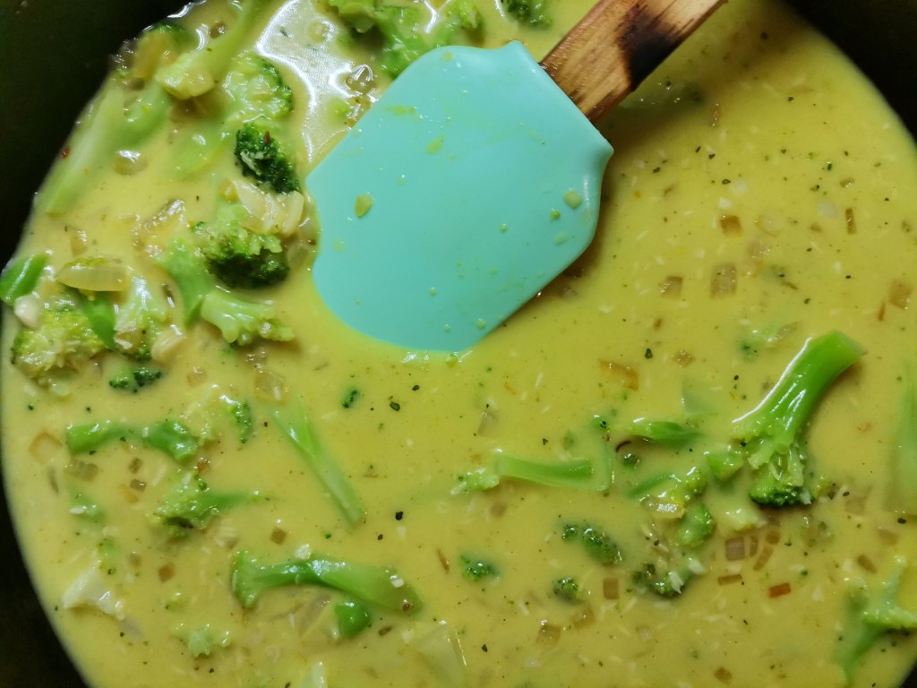 Podziel brokuły na małe różyczki. Ja miałam mrożony który potrzebował mniej czasu niż świeży. Dodaj brokuły i mleko kokosowe. Gotuj 2-3 minuty.