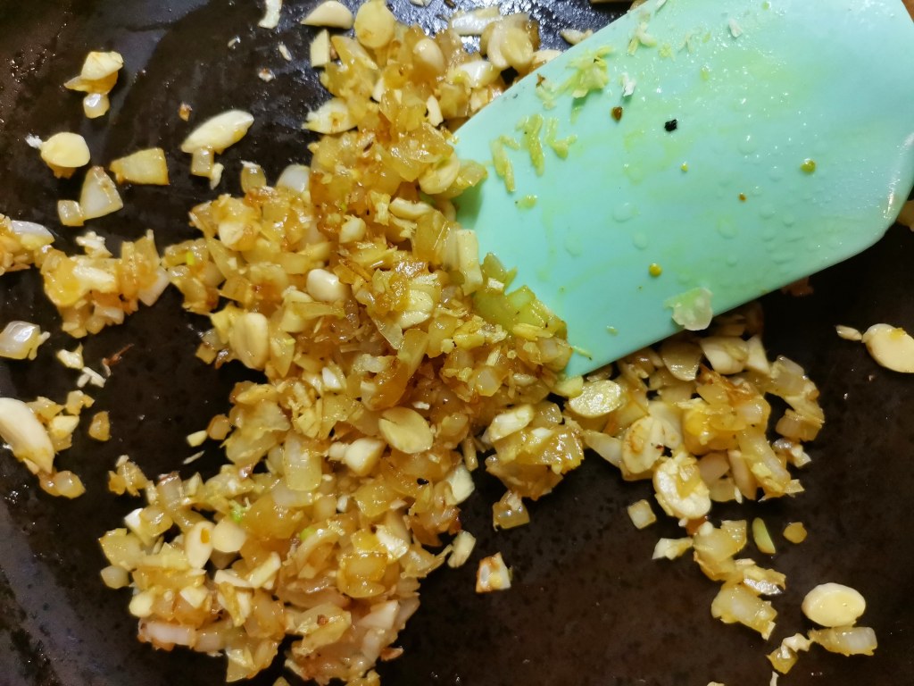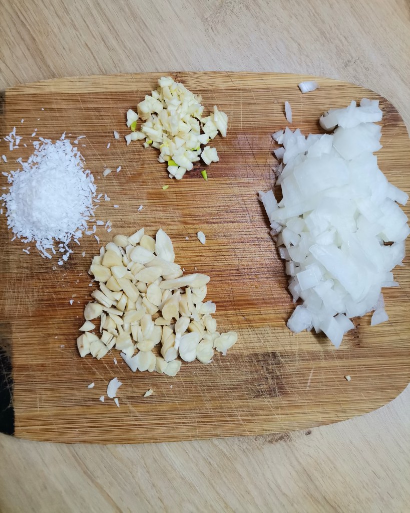 Poszatkuj na drobno cebulę, czosnek, imbir oraz migdały na płatki.