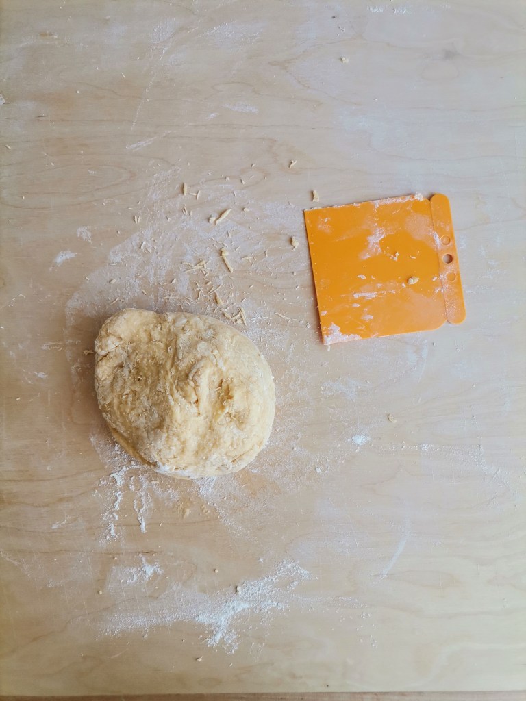 Czyścimy szpachlą stolnicę oraz dłonie zabieramy wszystko przy okazji wyrabiając ciasto.