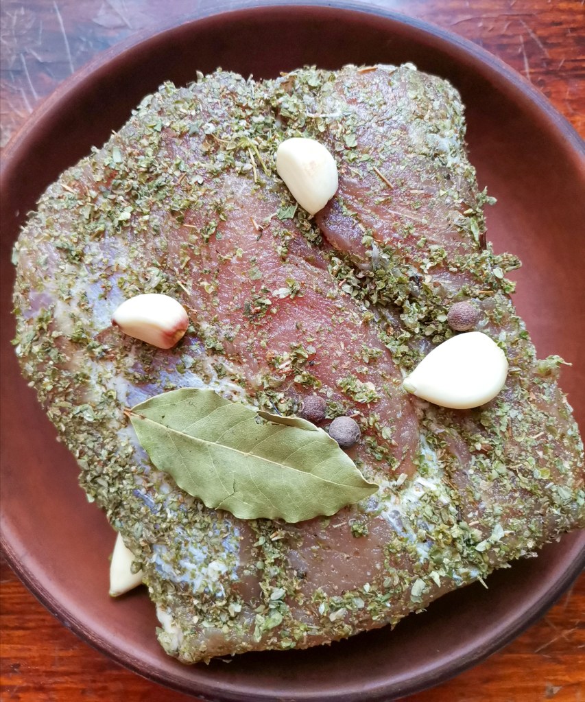 Oczyszczam schab z błonek. Nacieram majerankiem, solą dorzucam ziele angielskie, czosnek i liść laurowy. Tak natarte mięso zostawiam w lodówce na min 12 godzin. Jeżeli macie możliwość możecie przewrócić schab raz czy dwa i masować w międzyczasie.