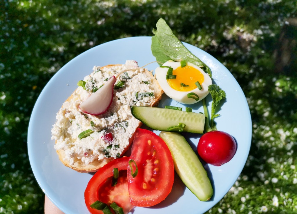 3. Jajka obieram, kroję na pół doprawiamy solą i szczypiorkiem. Kroję ogórek, pomidor, rzodkiewki i baton. Jeżeli możesz zjeść takie śniadanie w ogrodzie przy herbacie to twój dzień zacząć się lepiej nie mógł!