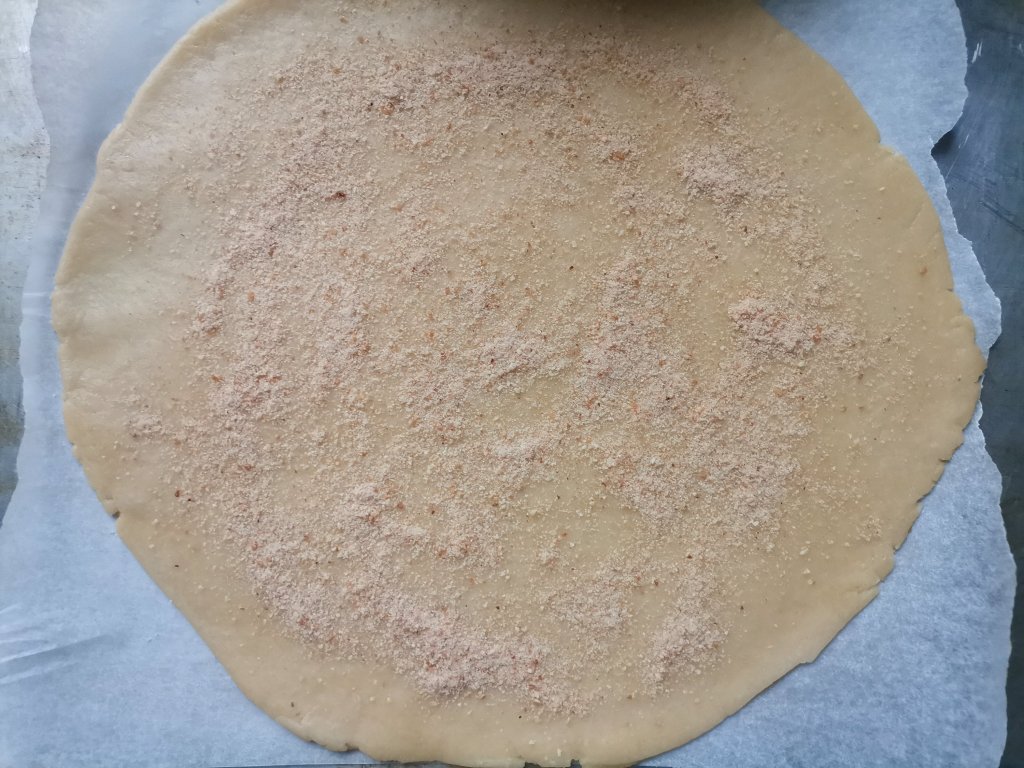 5. Nie musisz posypywać ciasta bułką tartą lecz truskawki mogą bardziej wsiąknąć w ciasto. Zostaw kilku centymetrowy rant, a na środek układaj truskawki uprzednio wymieszane z mąką ziemniaczaną.