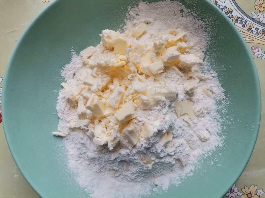 1. Mąke wymieszaj z zimnym masłem i pokrusz jak do kruszonki.