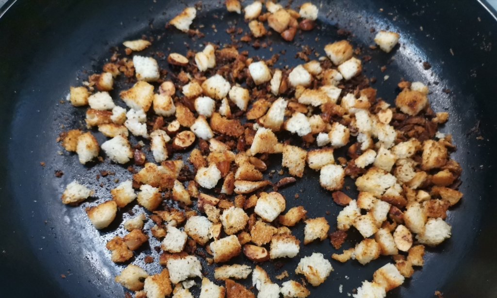 2. Podsmaż pokrojone kromki chleba i migdały na łyżce oleju.
