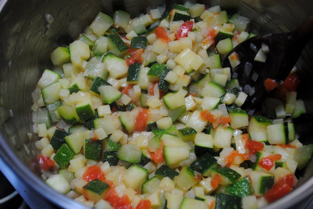 2. Podgrzej w garnku z grubym dnem oliwę. Podsmaż cukinię. Po 3 minutach dorzuć ziemniaki oraz cebulę. Dodaj pomidor z czosnkiem. Po minucie zalej warzywa wodą lub bulionem. Gotuj 15-20 minut na moderowanym ogniu.