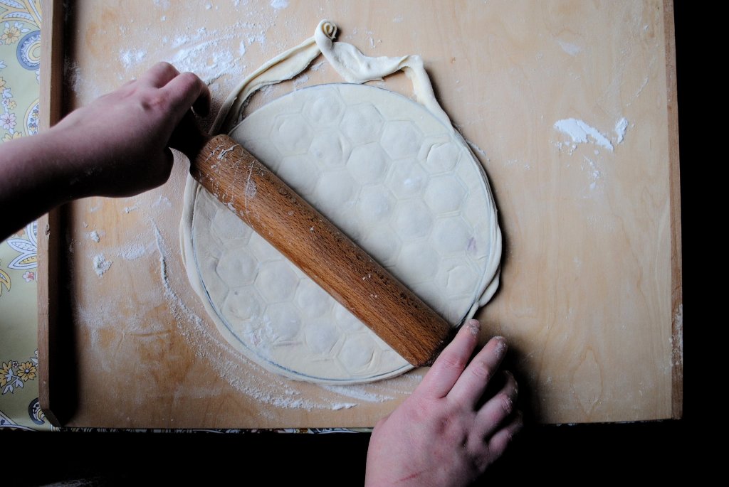 6. Kolejny płat ciasta rozwałkuj i nałóż na wypełnione pielmieni. Następnie przejeżdżaj walkiej po formie aż wszystkie pielmieni się odseparują.