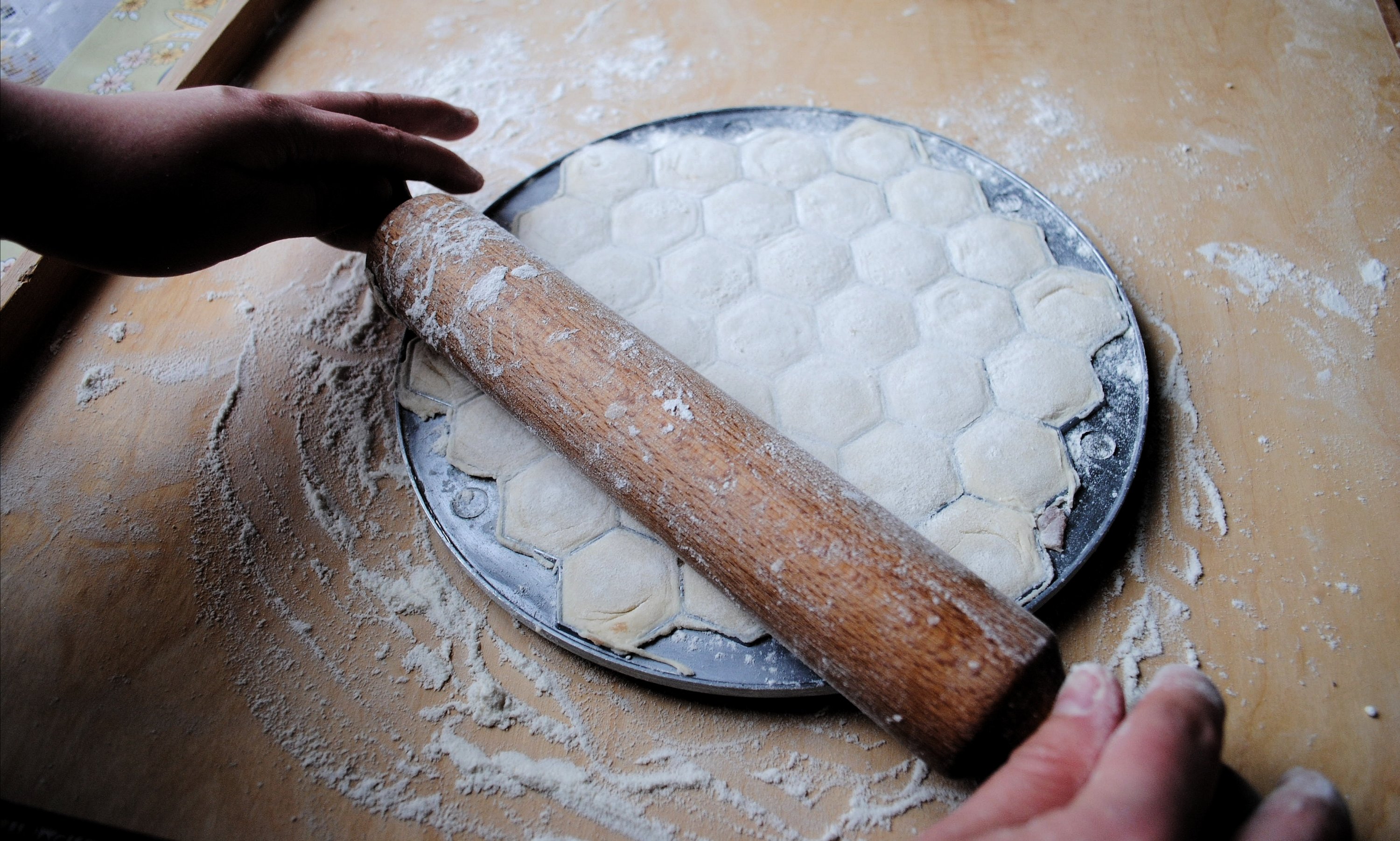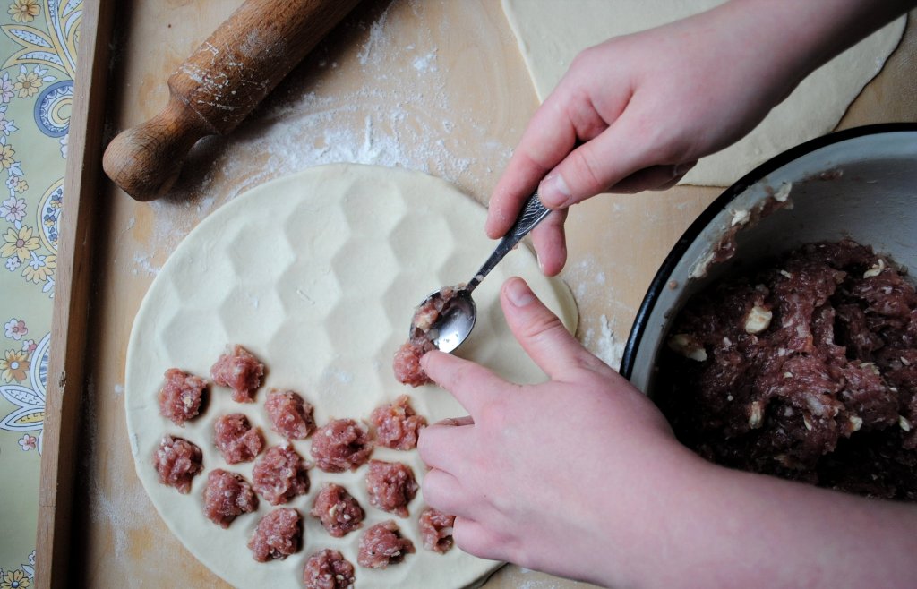 4. Lepiąc pielmieni ręcznie wałkuj płat ciasta i używając kieliszka lub wybranej szklanki wykrój kółeczka. Napełnij je farszem, sklej rogi i połącz oba końce.