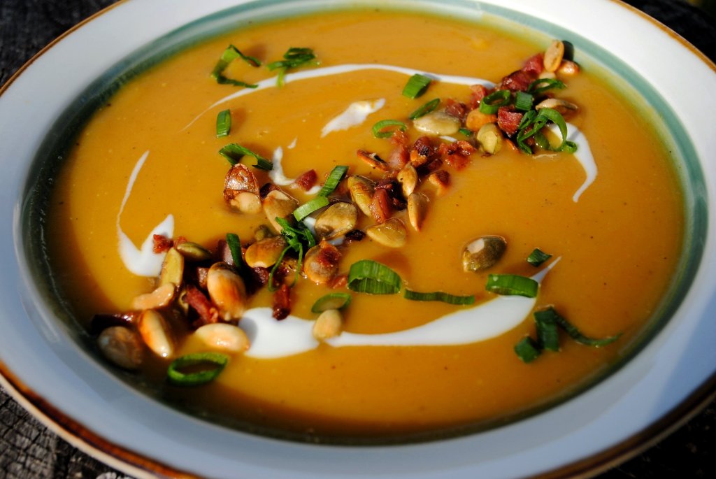 4. Zupę blenduj na gładki krem, a następnie przesiej przez sito lecz ten krok nie jest konieczny. Podawaj z kleksem śmietany, boczkiem smażonym z ziarnami dyni i okraszoną szczypiorkiem. Pycha!