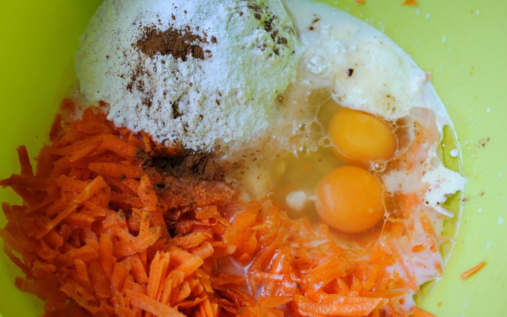 1. Marchewkę zetrzyj na tarce. Wszystkie składniki wymieszaj, a 1/3 masy zblenduj. Następnie dodaj rodzynki.