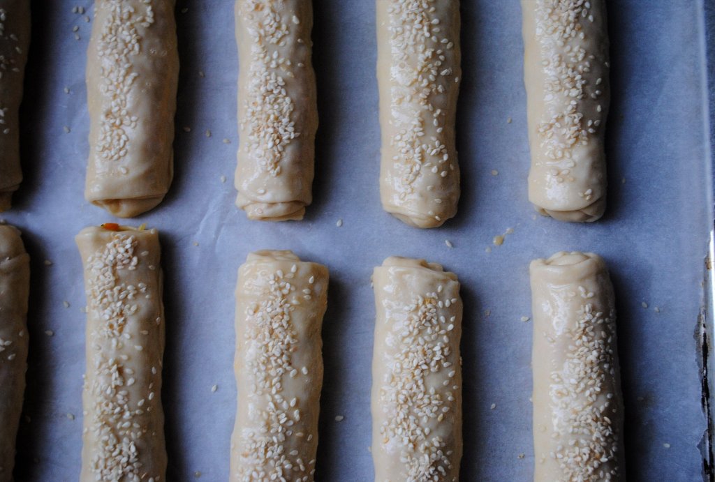4. Gotowe ruloniki odkładaj na blachę z papierem do pieczenia. Finalnie posmaruj jajkiem i posyp wybranymi ziarnami. Piecz przez 20-25 minut.