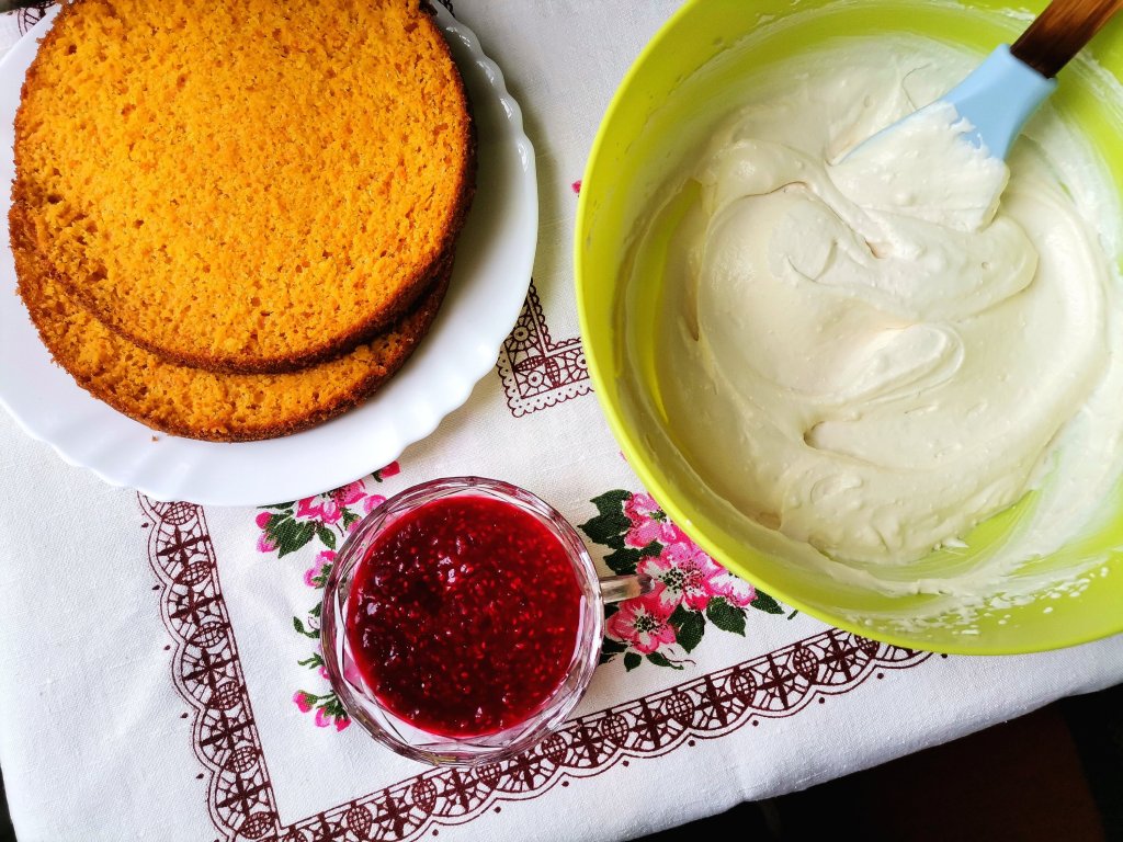 2. Pierwszy blat posmaruj połową kremu. Na krem wyłóż 2/3 fruzeliny. Połóż następny blat ciasta i posmaruj go pozostałą frużeliną. Na wierz wyłóż resztę kremu. Możesz również posmarować boki torciku.
