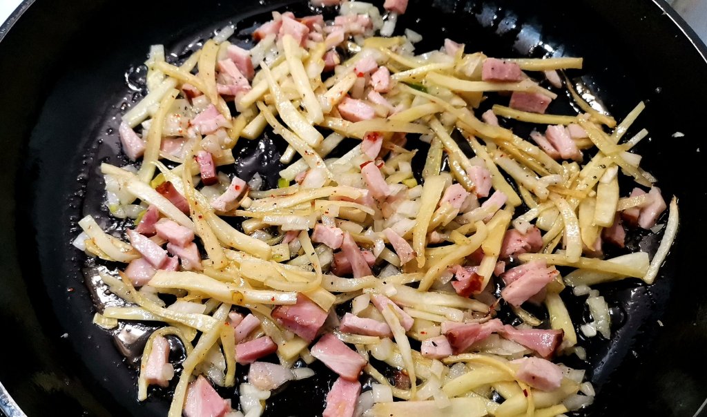 1. Zagotuj wodę z solą na makaron. Boczek pokrój w kostkę, pietruszkę w słupki, a szalotkę drobno. Na patelnie wrzuć wszystko razem z łyżką oliwy. Smaż 2-3 aż pietruszka będzie miękka.
