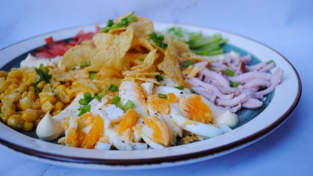 Kolejna z serii ukraińskich sałatek. Tak prosta i smakowita ze składników które każdy ma w domu. Teściowa zwie ją słomkową albo śmiesznie „kupkami”, bo wszystko się układa kupkami. Bardzo prosta w przygotowaniu. Chodź ma minus. Jest idealna tylko dopóki chipsy nie zmiękną. Sałatkę wymieszaj i od razu podawaj!
