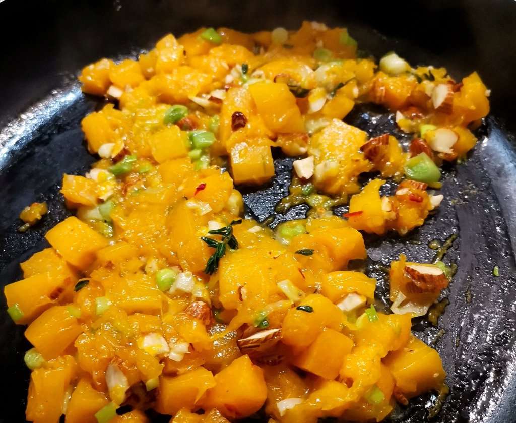 2. Dynie, szalotkę i czosnek pokrój w kosteczkę. Duś na łyżce oliwy do miękkości. Dodaj 10 posiekanych migdałów i tymianek. Następnie blenduj na krem z odrobiną wody.