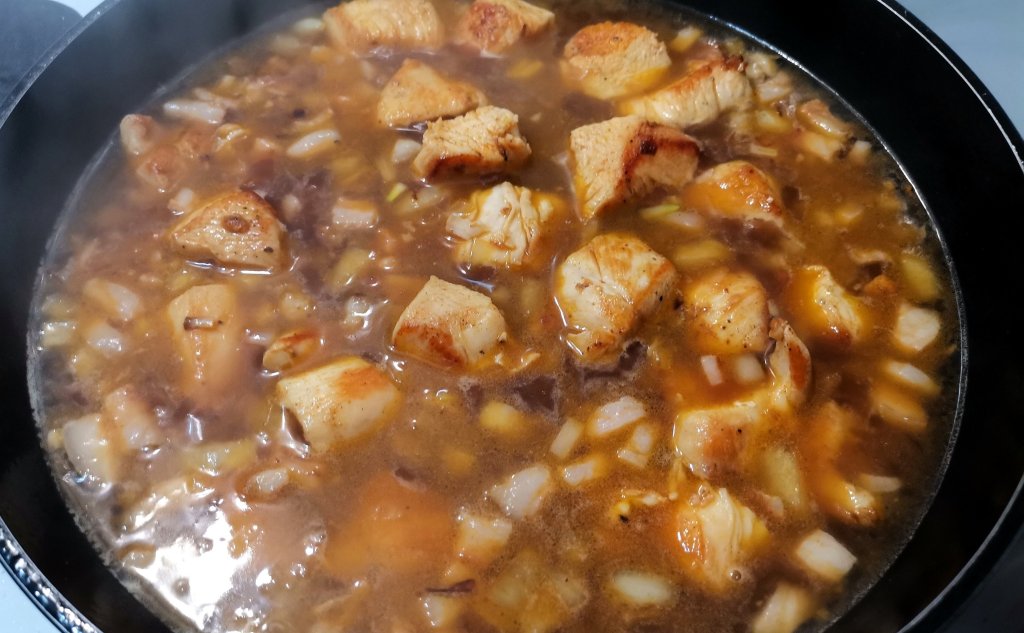 1. Pokrój kurczaka w kostkę, dopraw solą i pieprzem. Podsmaż go na oliwie na dużym ogniu tylko do złotego koloru. Boczek, cebulę i czosnek pokrój w mniejszą kosteczkę i dodaj do podsmażonego kurczaka. Smaż wszystko na mniejszym ogniu aż cebula się udusi. Następnie wlej wino i odparuj je. Wlej na patelnie tyle wody aby zakryć wszystko. Gotuj do miękkości kurczaka.