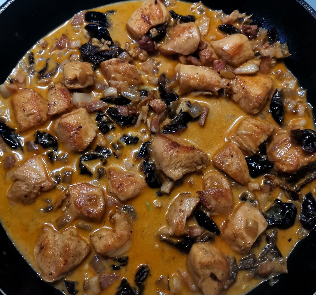 Jeden z moich ulubionych sosów z kurczakiem. Dodatek wędzonej śliwki z boczkiem podkreśla charakterystyczny smak sosu. A wędzona papryka dodaje kopa. Co do dodatków przeróżne kluski się tutaj sprawdzą, ale również placki ziemniaczane czy pure różnego pokroju.