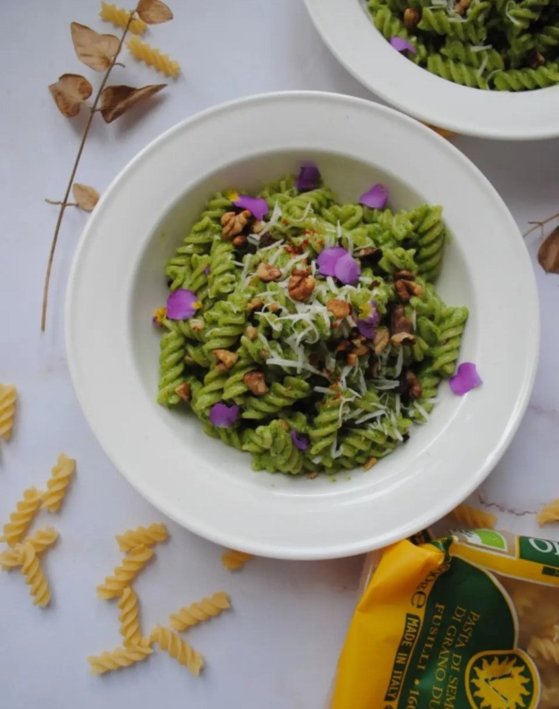 Postaw wodę z solą na makaron, a następnie ugotuj go. Utrzyj wszystko w moździerzu, melakserze czy ręcznym blenderze. Zachowaj chochle wody z makaronu. Pesto dodawaj do ugotowanego makaronu. Reguluj konsystencje wodą z makaronu. Pycha!
