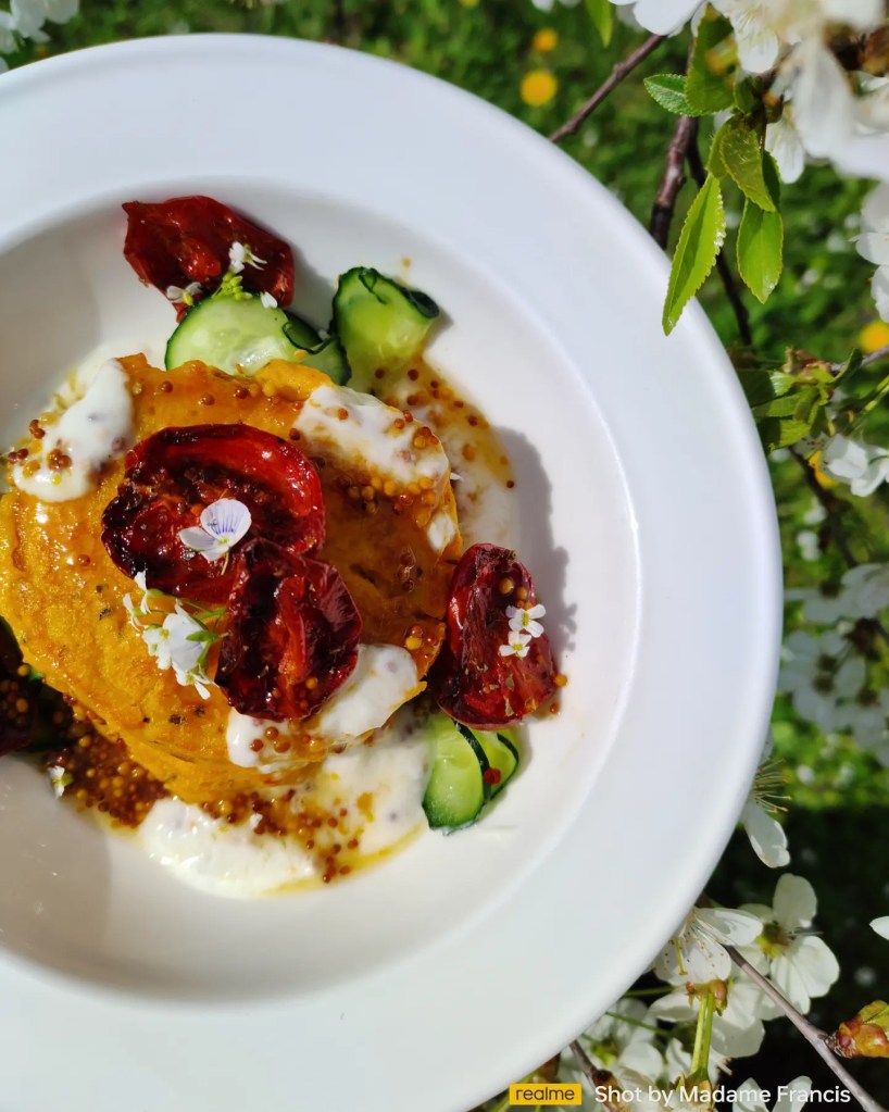 Ekspresowe wykwintne śniadanie z różnorodnymi dodatkami. Słodkie wyraziste placuszki kukurydziane wzbogacone domowym twarogiem. Dziś placuszki akompaniują marynowane na szybko ogórki i pieczone pomidorki.