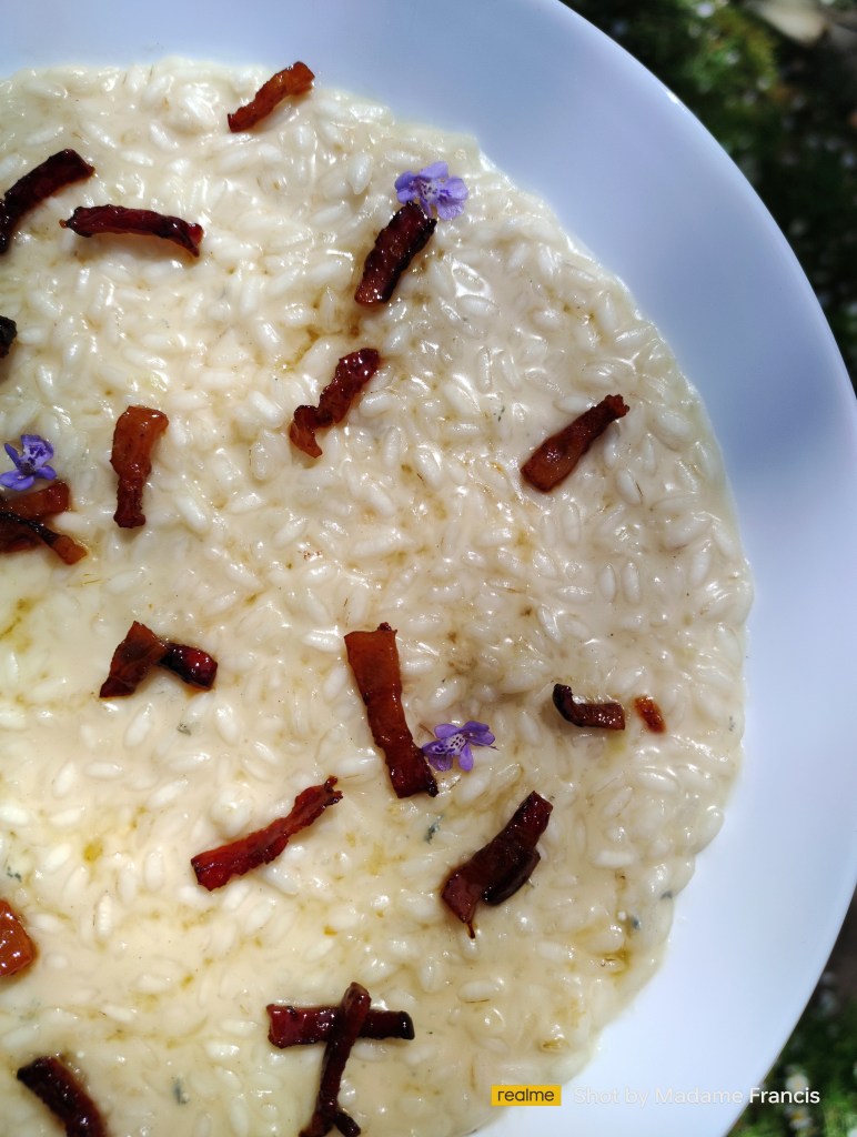 Kremowe risotto zwieńczone chrupiąco-klejącym miodowym boczkiem. Te danie wyszło same z siebie jakoś tak po prostu. Mieliśmy ochotę na risotto zostało też trochę sera gorgonzola tylko czegoś brakowało. Kawałek boczku się uśmiechał z lodówki. Smak przełamał miód. Karmelizowany boczek jest bardzo popularny. Tutaj prosto usmażony i finalnie wymieszany z miodem. To był składnik który dopełnił te risotto.