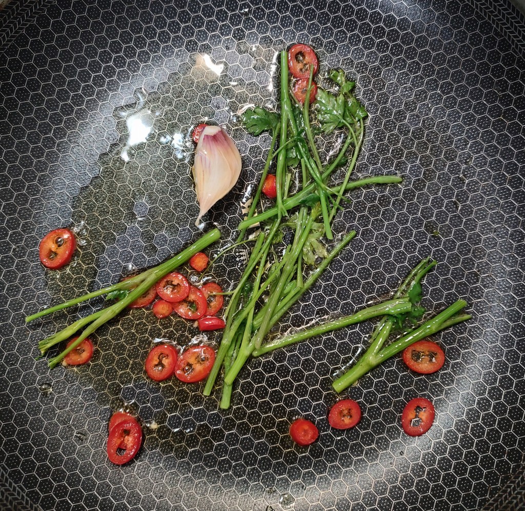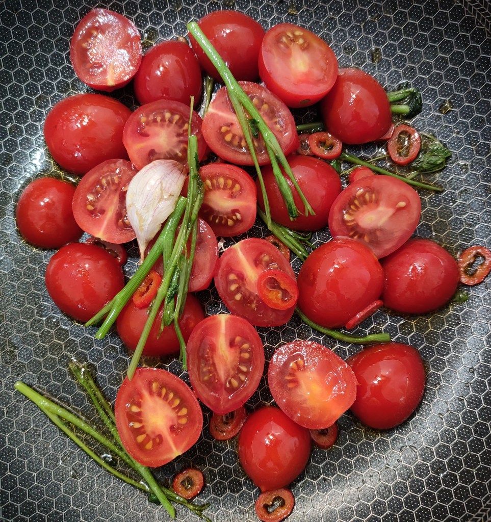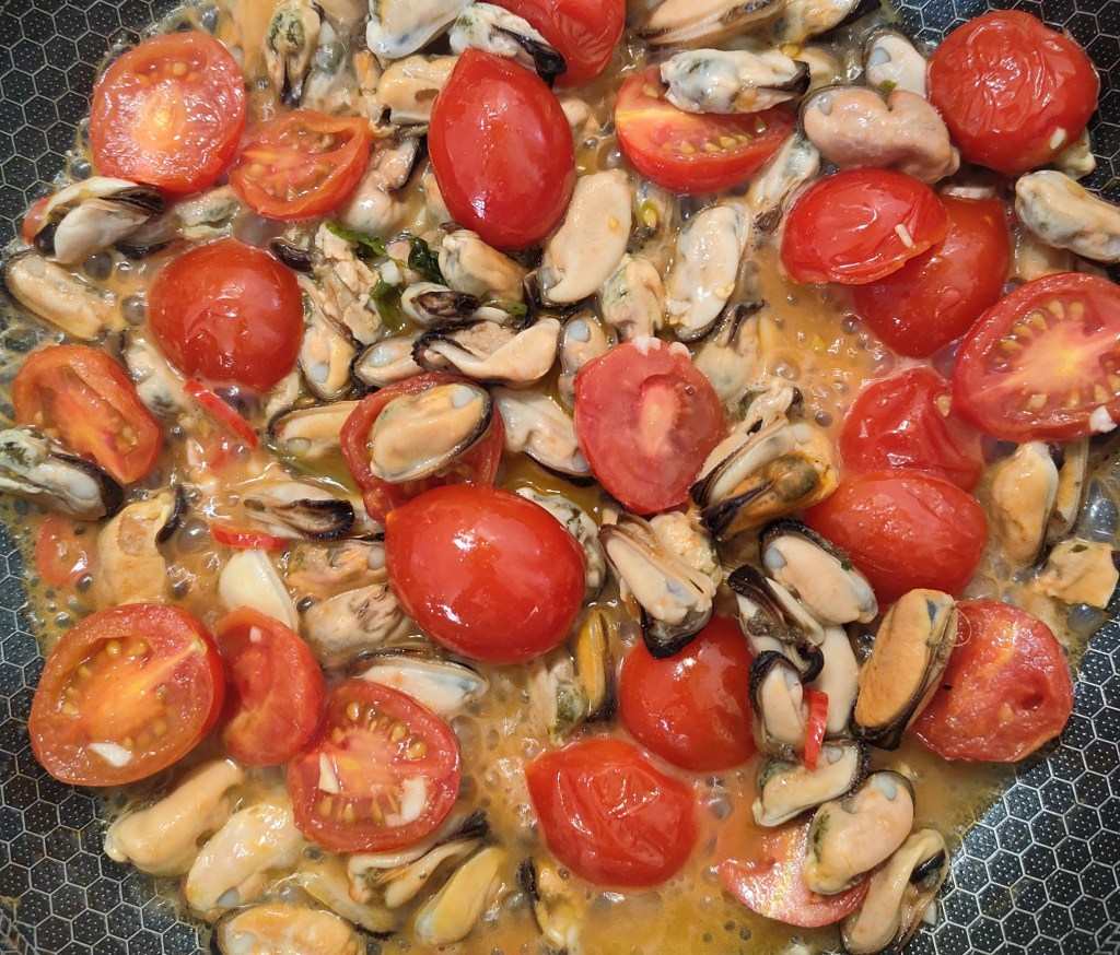 2. Gałązki pietruszki, czosnek i chili smażę delikatnie na oliwie. Dodaję pokrojone pomidorki na patelnię smażę kolejne 3 minuty. Z patelni usuwam gałązki pietruszki i czosnek. Omułki lądują na patelni po minucie podlewam winem i czekam aż odparuje.