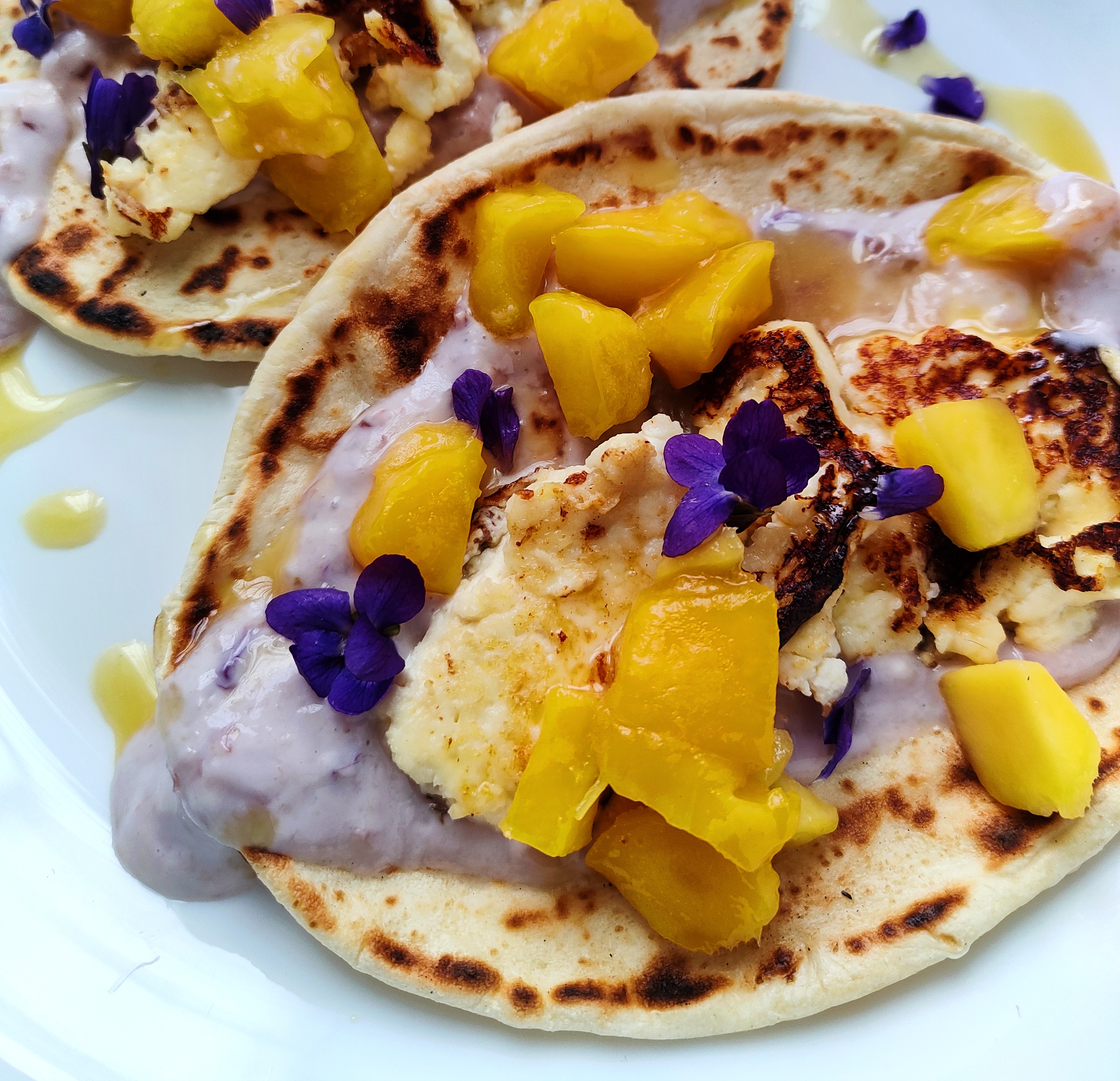 Jogurtowe chlebki z fiołkowym jogurtem, serem paneer i mango.