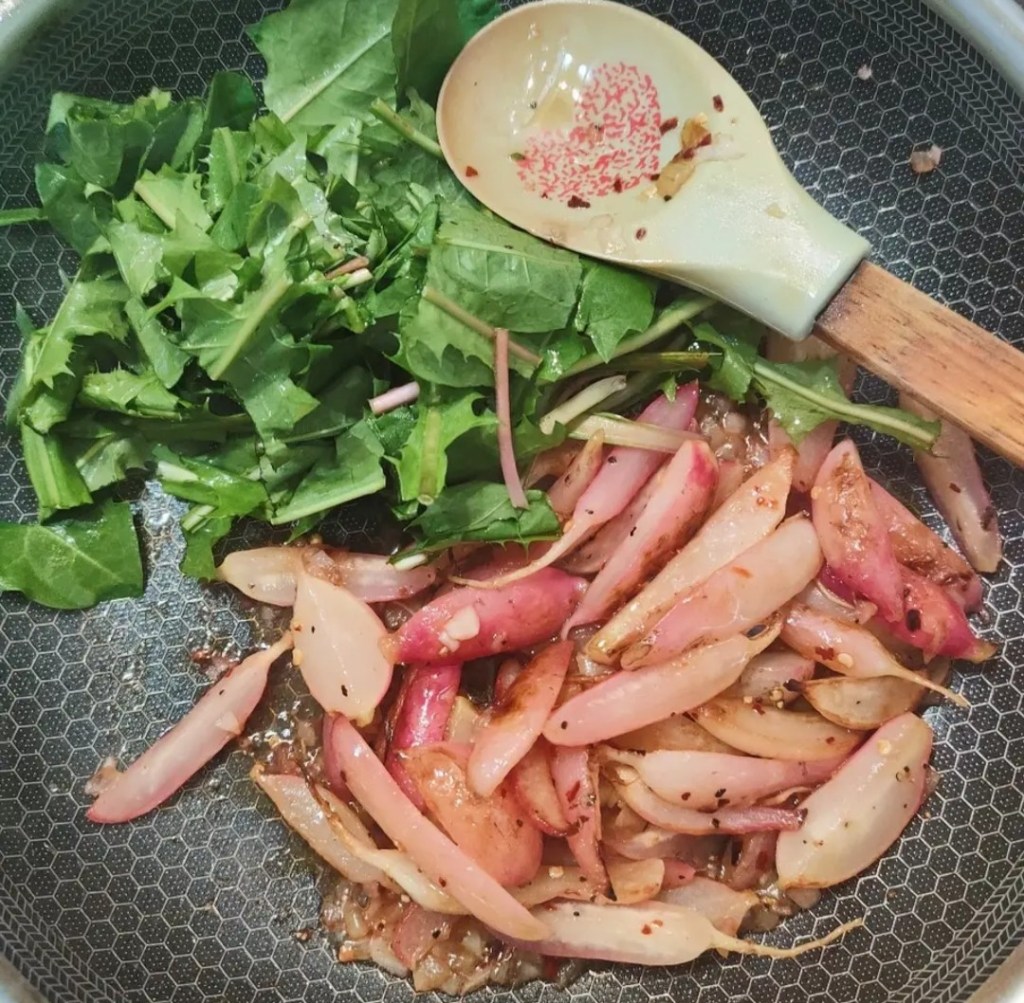 1. Postaw wodę na makaron. Rzodkiewki przekrój na cztery. Zacznij je smażyć na oliwie. Następnie pokrój cebulkę i dodaj do rzodkiewki. Umyj liście mniszka.