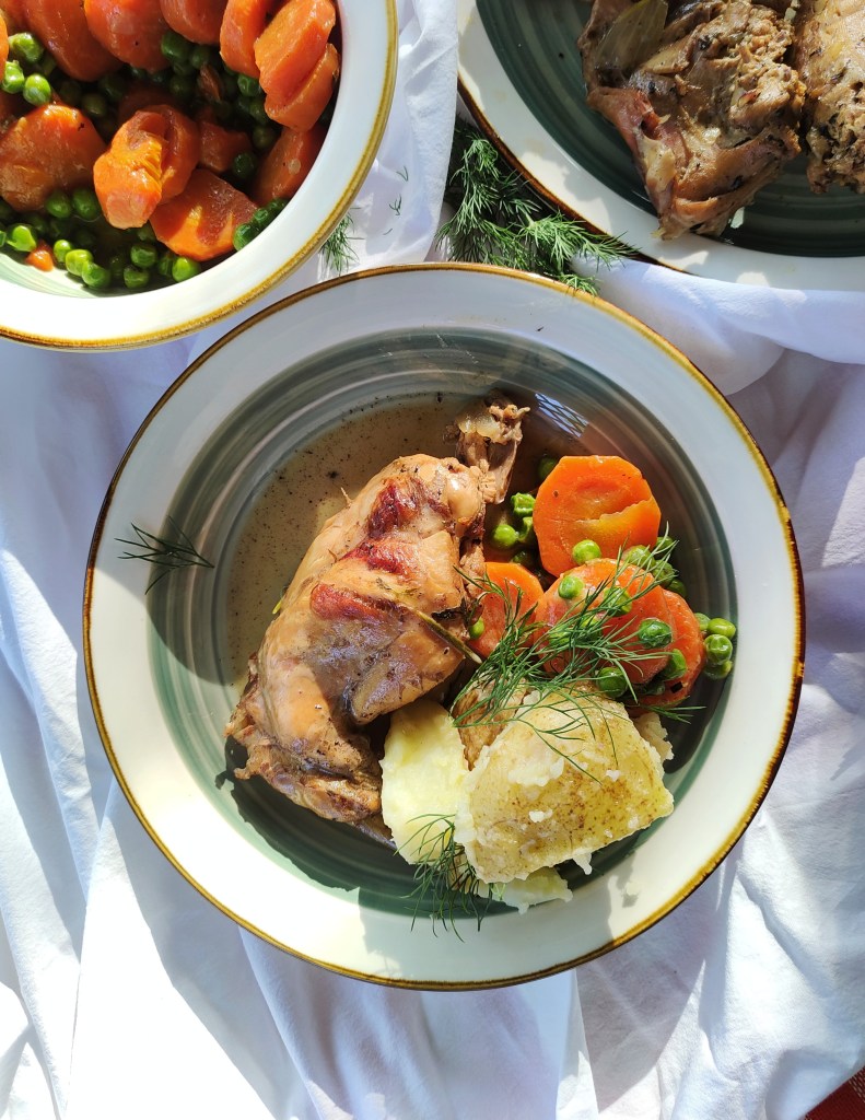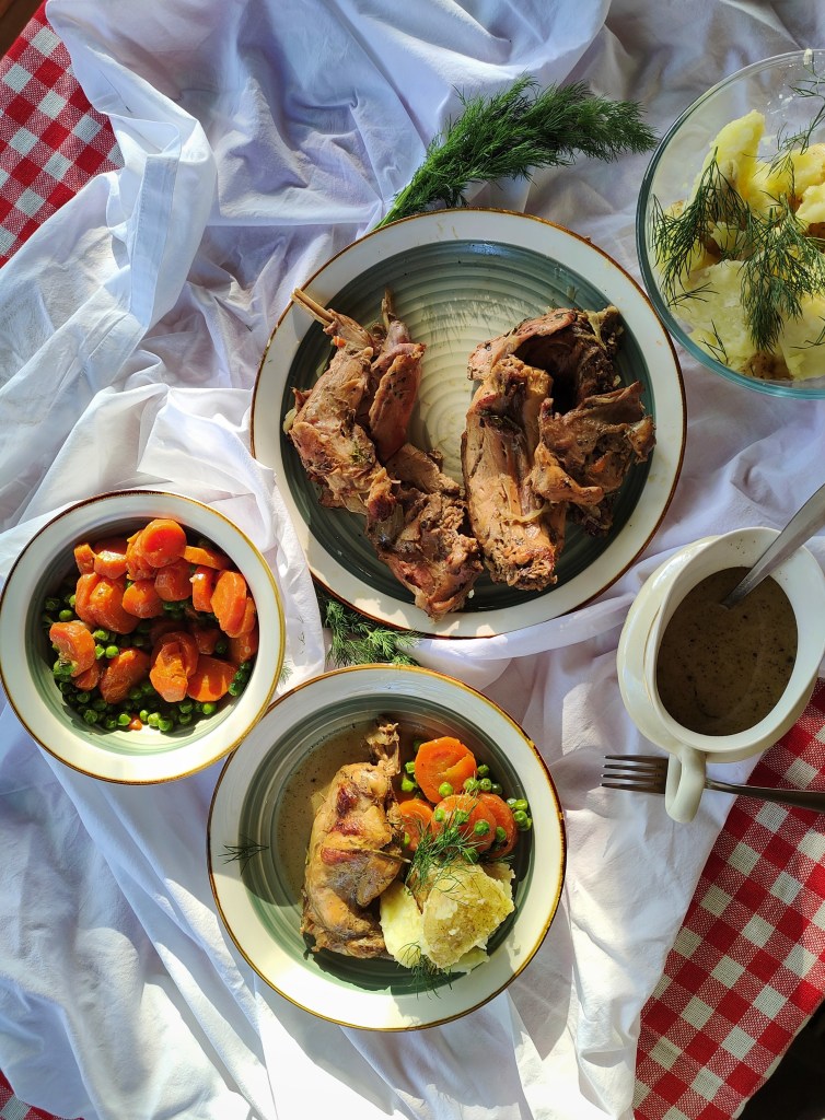 4. Kiedy mięso jest gotowe wyjmuję je, a do sosu dodaję śmietanę. Sos przecedzam lub nie i doprawiam do smaku. Dziś podaję z młodymi ziemniakami i koperkiem. Groszek mrożony duszę z kawałkiem masła i kilkoma łyżkami sosu z pod królika. Do groszku dorzucam marchewkę z gotowania królika. Na Instagram znajdziesz wideo z przygotowaniem. Pycha!