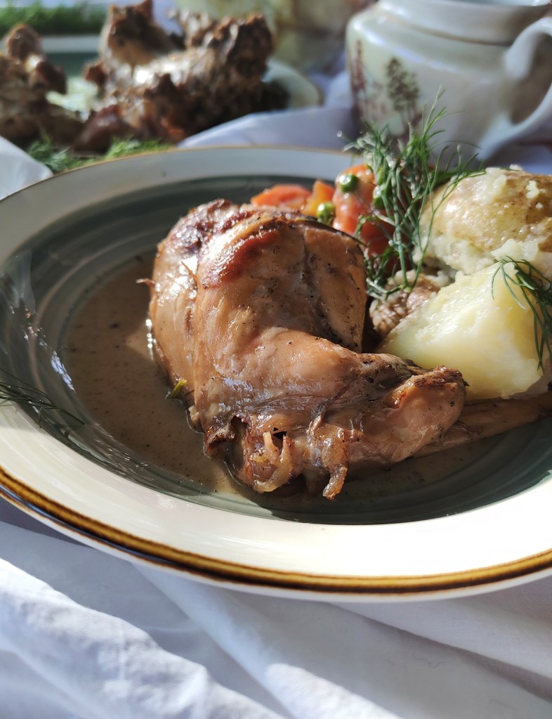 Aromatyczny królik wyleguje się najpierw w winie aby potem utonąć we własnym sosie oraz domowej śmietanie kremówce. Idealnie smakuję w towarzystwie puree, polenty, pampuchów czy kaszy.