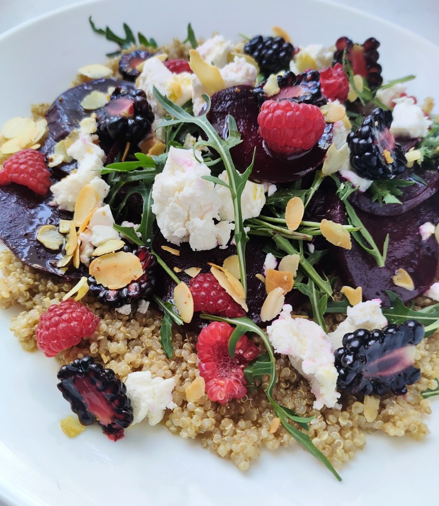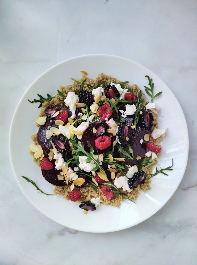 4. Wykładam quinoa i na niej układam buraki. Posypuję wierzch rukolą, fetą, migdałami i owocami. Wszystko polewam oliwą. Quinoa możesz zamienić kaszą kus kuś czy bulgurem. Pycha!