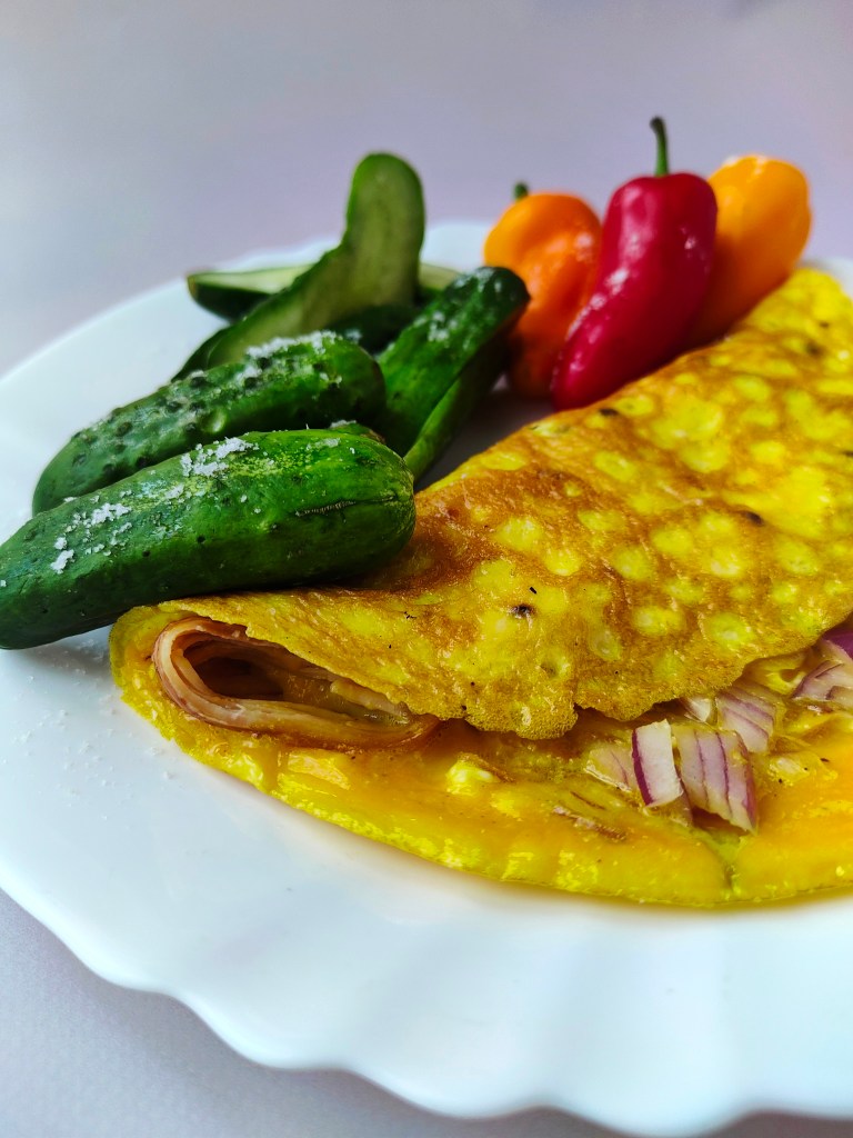 - Rozgrzewam patelnię i smaruje masłem. Jajka rozbijam z łyżką wody. Dodaję serek wiejski, sól oraz pieprz. Wylewam na patelnię i dorzucam kurczaka. Zakrywam pokrywką. Kiedy się zetnie wykładam na talerz.