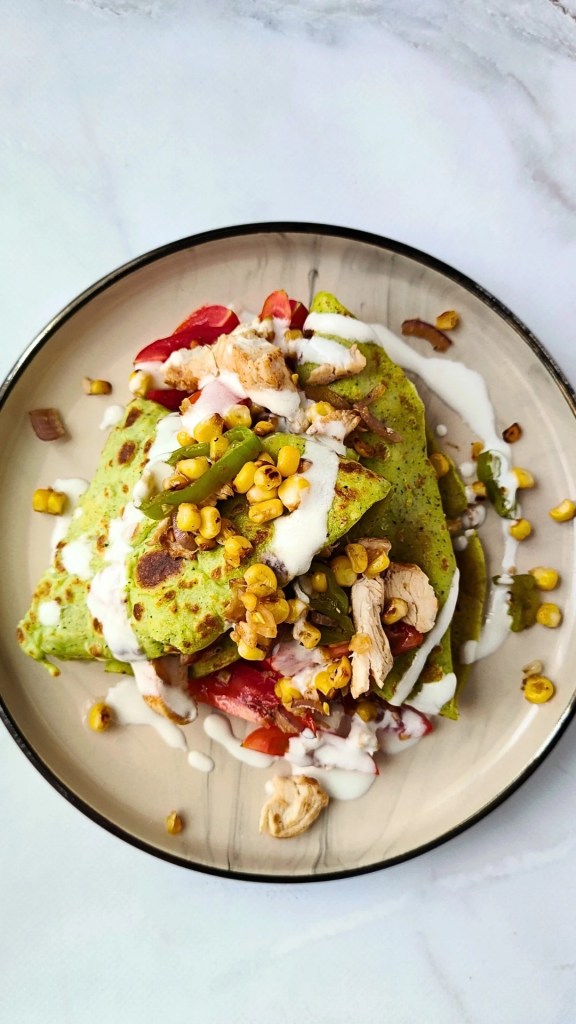 Naleśniki z cukini faszerowane kurczakiem, kukurydzą i chili, polane dressingiem.