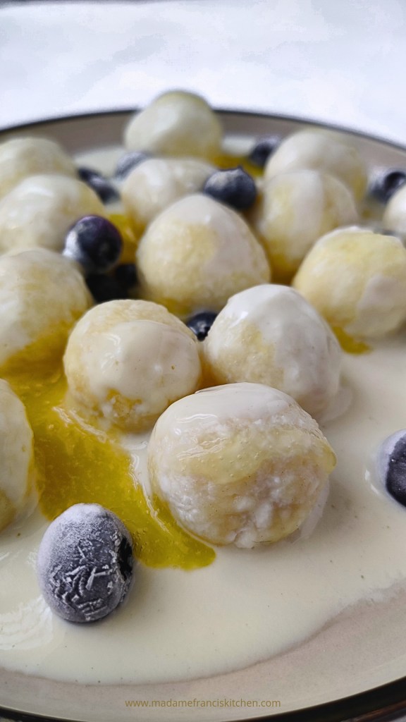 1. Gotuję wodę na kluski. Twaróg rozcieram widelcem i mieszam z białkiem. Następnie dodaję mąke oraz białko. Kulam kluseczki. Gotowe odkładam na podsypaną mąką tackę.